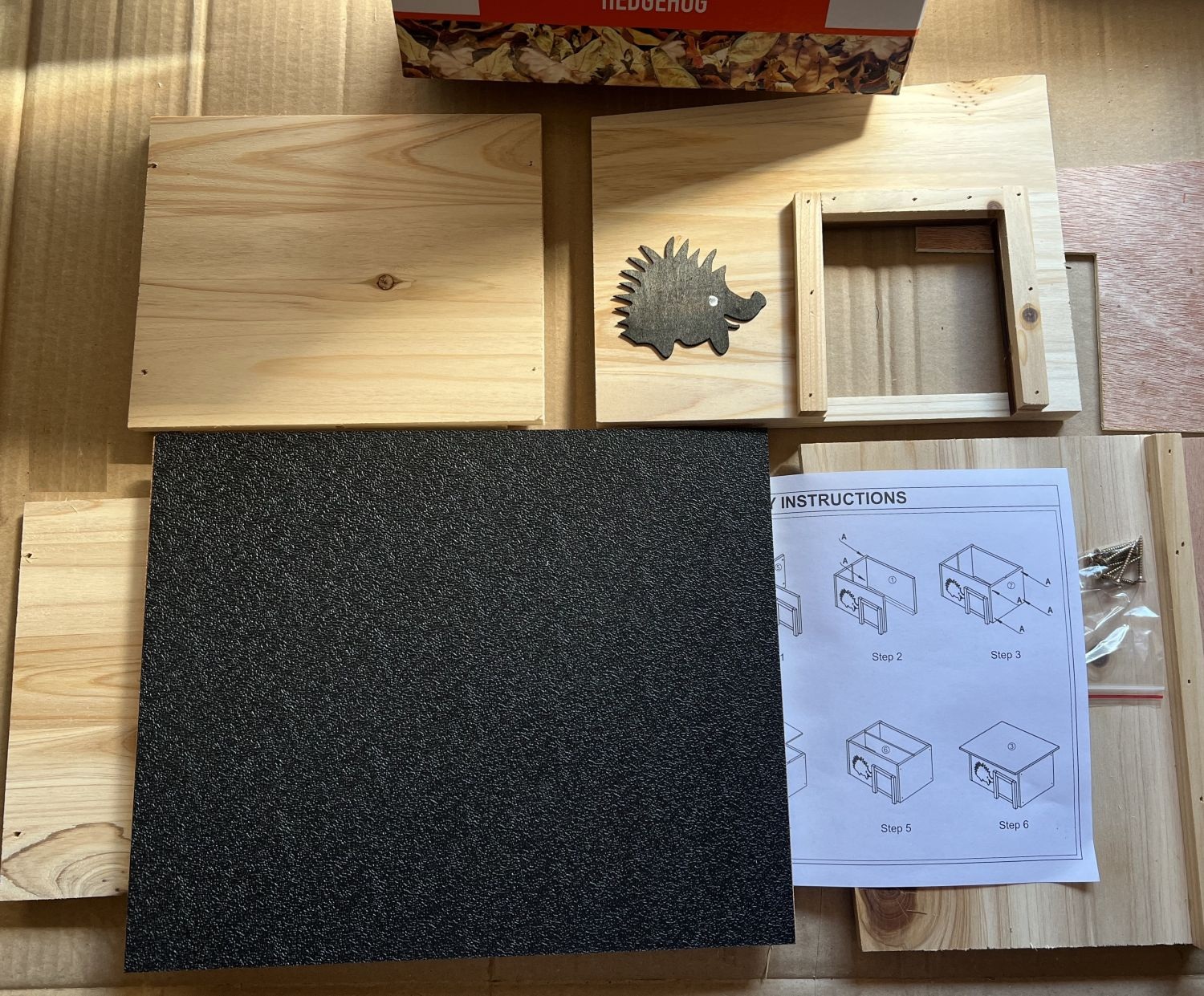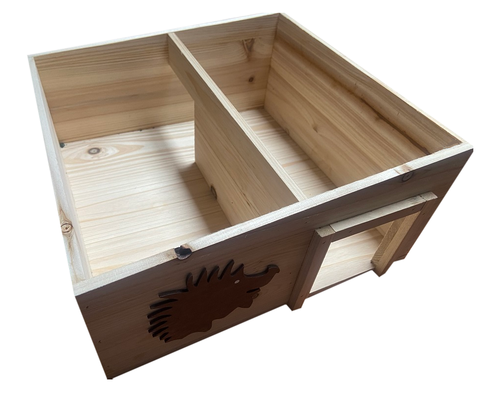 Drewniany, dwukomorowy domek dla jeży do samodzielnego złożenia.