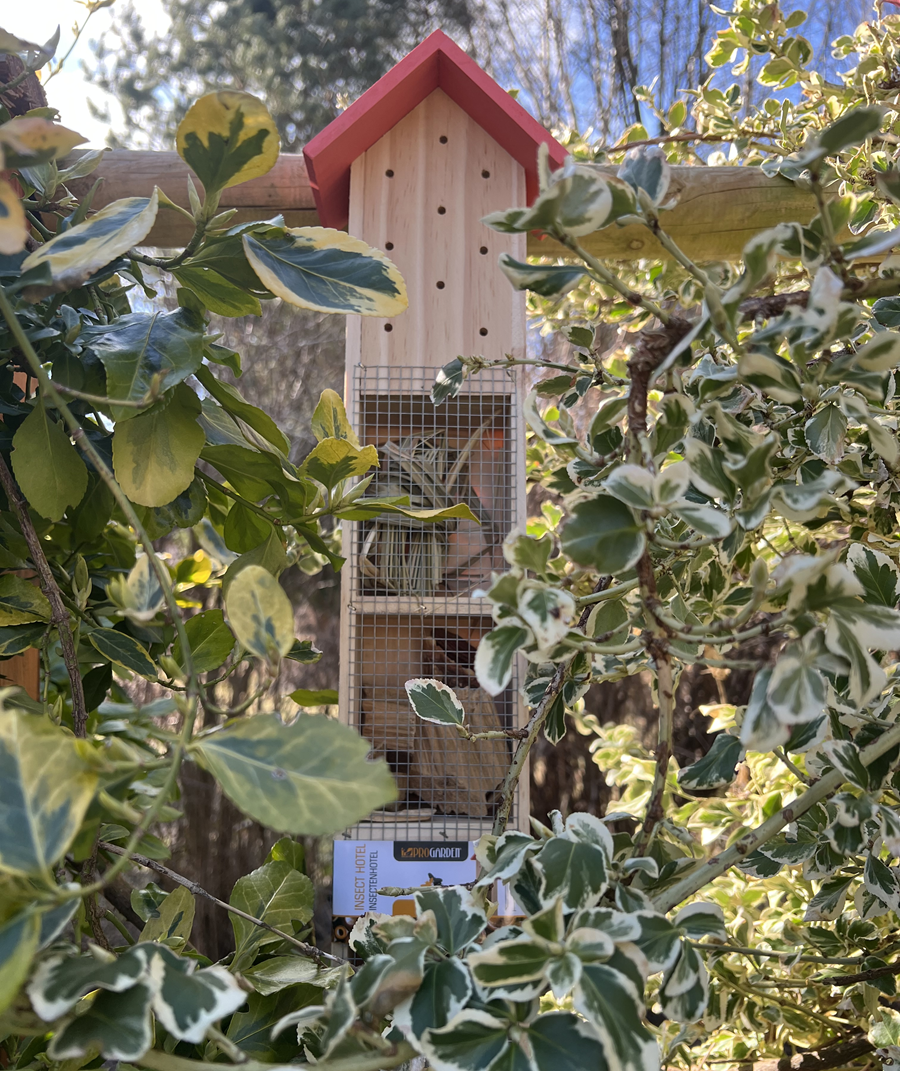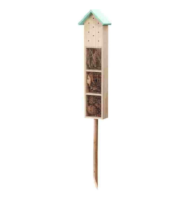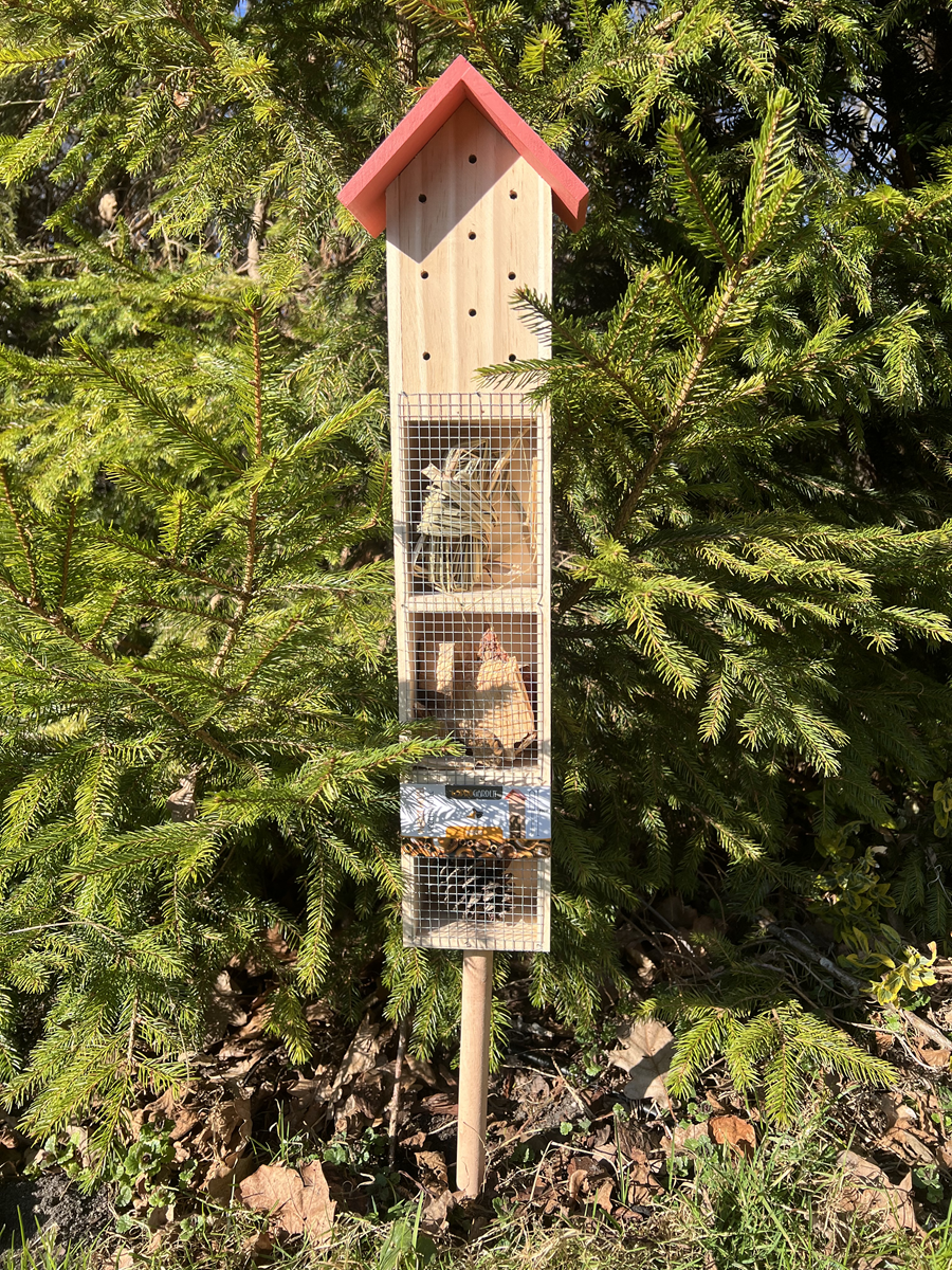 - trzy komory z naturalnym wypełnieniem z szyszek, trawy i zrębek dla dzikich zapylaczy,